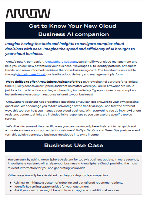 ArrowSphere Assistant offers quick, accurate answers and generates visual aids and tailored recommendations for you and your customers’ cloud business. It even automates email composition and tracks cost savings, making cloud management simpler and more efficient than ever.